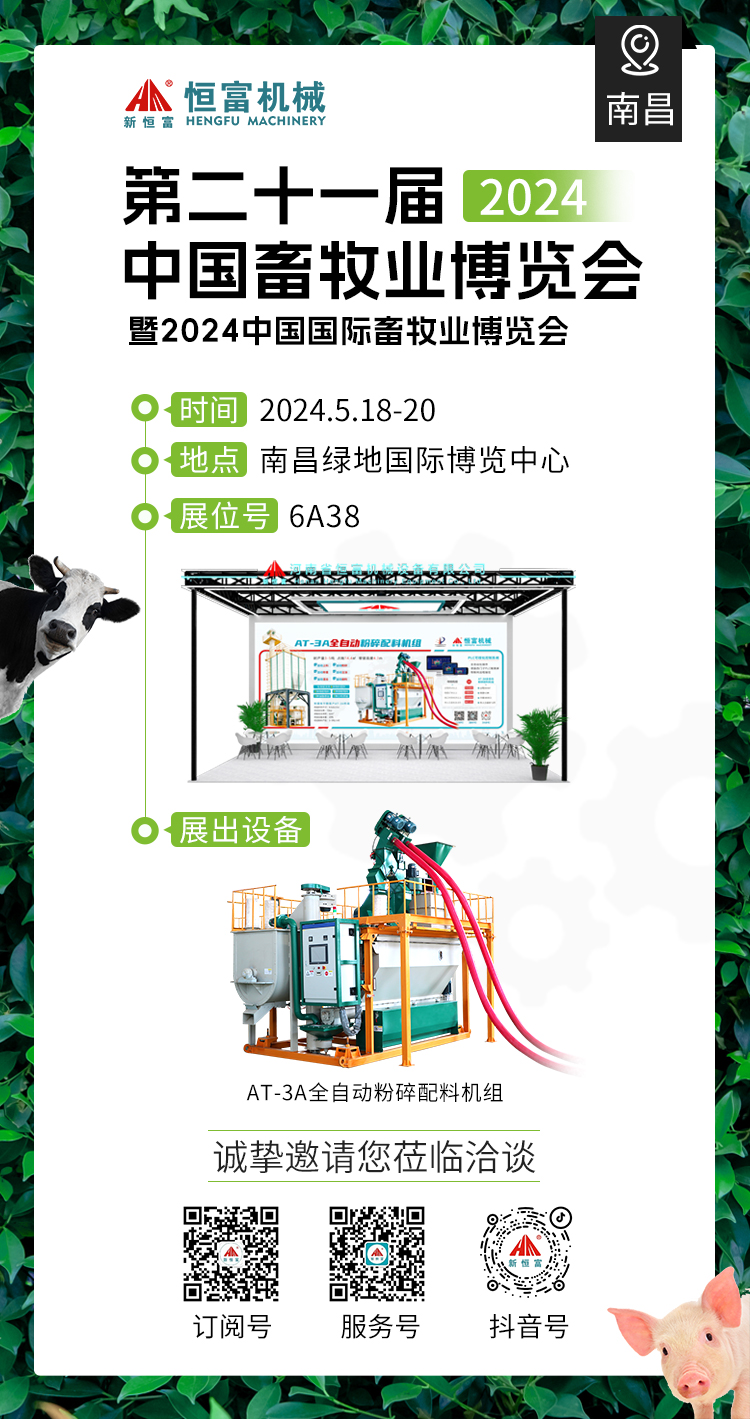 由中国畜牧业协会主办的第二十一届(2024)中国畜牧业博览会,定于5月18日在江西南昌绿地国际博览中心举行。 本次畜牧博览会,不仅汇聚了国内外众多知名畜牧企业,更将呈现出一系列引人瞩目的产业新动向。 河南恒富饲料机械受邀参展,将携带我司自主研发生产的AT-3A全自动粉碎配料机组亮相展会。 届时,我们将以万分饱满的精神,诚期您的光临! 展位号:6A38 时间:2024.5.18——5.20 地点:江西南昌绿地国际博览中心 美工|于洋 编辑|石玉珂 审核|余晓理 恒富机械一家集生产、科研、销售、安装、售后于一体的实体企业。