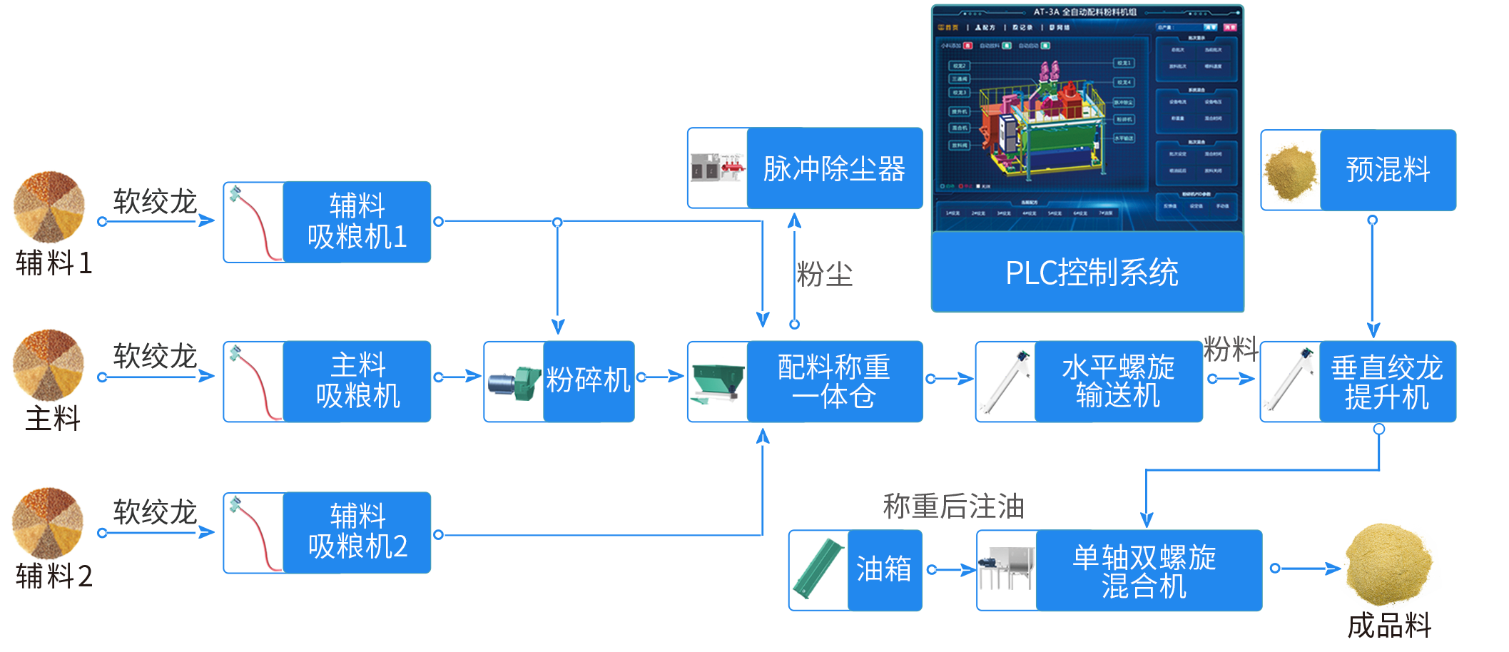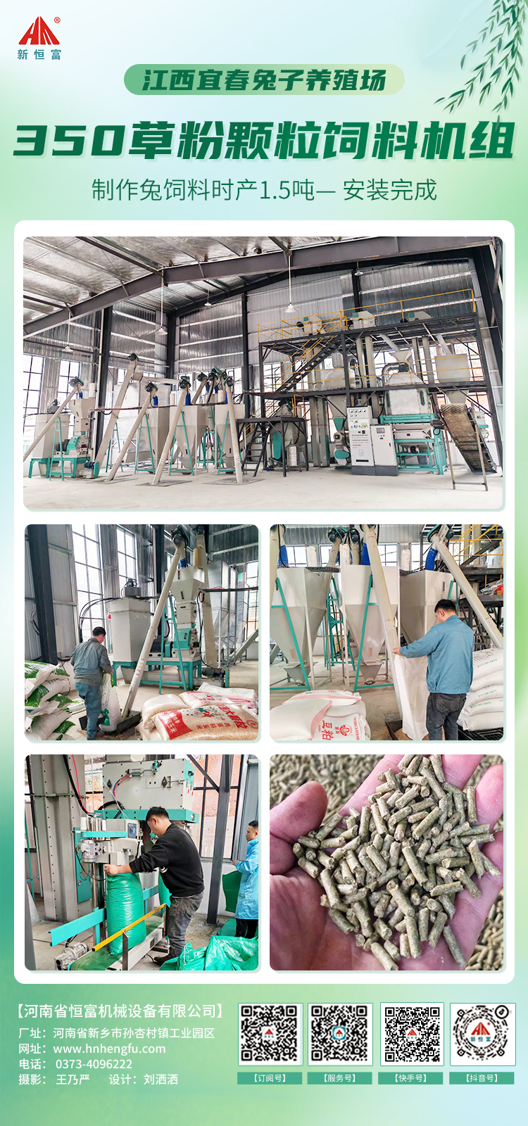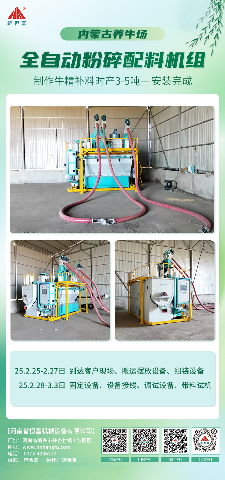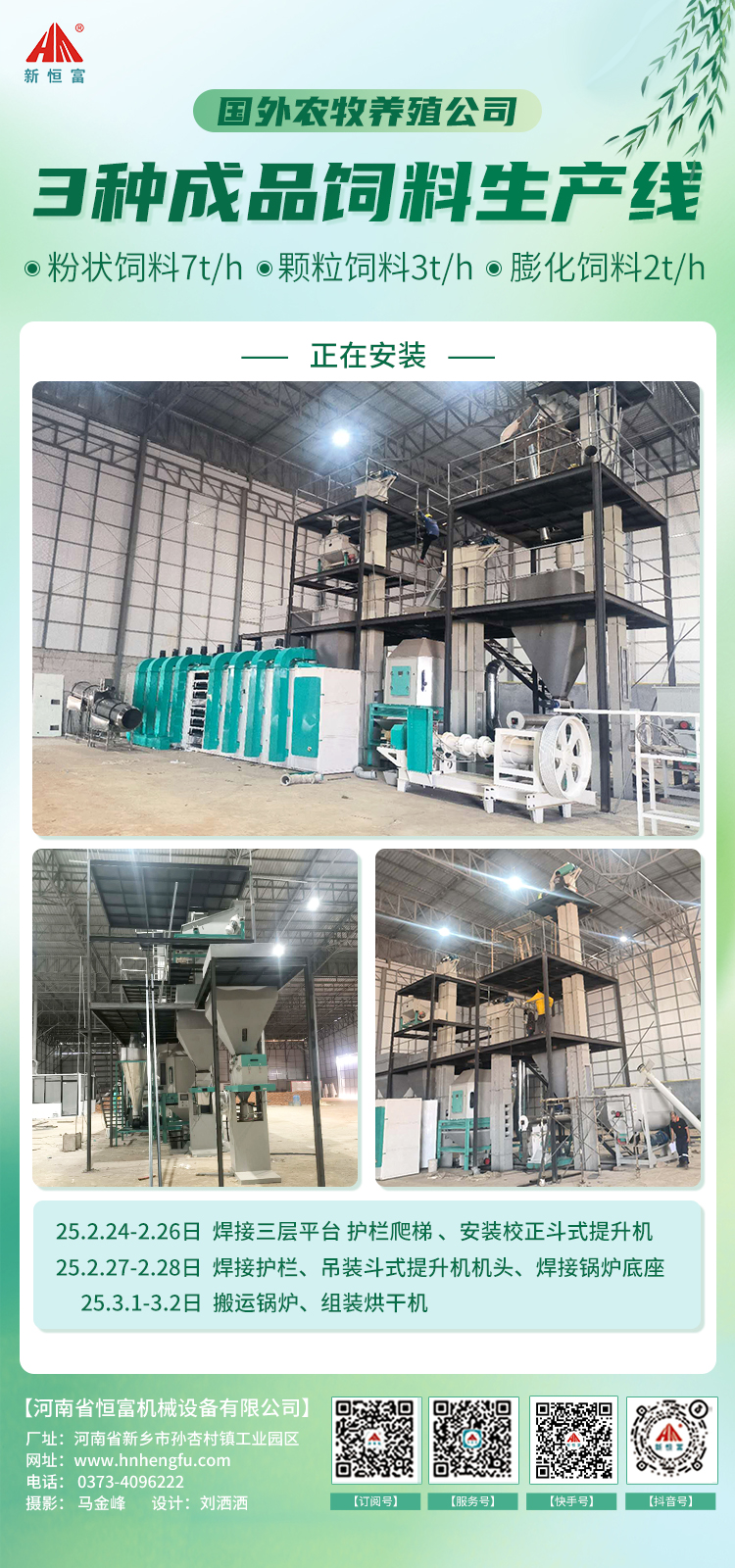 On site pictures 图 片 内蒙古 | AT-3A全自动粉碎配料机组 机组简介: 内蒙古乌兰浩特养牛场,时产3-5吨全自动粉碎配料生产线安装完成。 该设备主要是加工牛精补饲料,是一款集上料、粉碎、称重、注油、混合、放料等多个工序于一体的综合性设备。高度4.3m,占地仅需14.4㎡,3天就可安装完成。使用智能触摸屏一键操作不仅能够实现饲料生产的全自动化作业,还提高了生产效率和产品质量。适合各类大、中、小型饲料加工厂、养殖场使用。 该机组2025年2月24日出发,2月25日到达现场,3月3日安装完成,安装用时共计7天。 AT-3A工艺流程: 江西宜春 | 350草粉颗粒饲料机组 机组简介: 江西宜春兔子养殖场,时产1.5吨草粉颗粒饲料加工机组安装完成。 该机组主要是做兔饲料,前端搭配有水滴型饲料粉碎机、12m³苜蓿粉仓、3个2m³料仓以及1个2m³配料秤,中间搭配有卧式单轴双螺带饲料混合机、环模饲料颗粒机,后端搭配了逆流式饲料冷却器、饲料振动挂筛以及自动定量饲料包装机等。该机组先对玉米进行粉碎,然后将玉米粉、苜蓿粉等进行称重、配料,随后进行混合、制粒,最后对压制出来的成品颗粒饲料进行冷却、筛分、包装。本条生产线是一条完整的颗粒饲料加工机组,不仅可以做草粉颗粒饲料还可做精粮颗粒饲料。 2025年1月17日出发,3月3日安装完成,安装用时共计32天(除春节休息)。 工艺流程: 国外 | 3种成品饲料生产线 机组简介: 国外农牧养殖公司,时产2-7吨3种成品饲料生产线正在安装。 该机组主要是做兔饲料,前端搭配有水滴型饲料粉碎机、12m³苜蓿粉仓、3个2m³料仓以及1个2m³配料秤,中间搭配有卧式单轴双螺带饲料混合机、环模饲料颗粒机,后端搭配了逆流式饲料冷却器、饲料振动挂筛以及自动定量饲料包装机等。该机组先对玉米进行粉碎,然后将玉米粉、苜蓿粉等进行称重、配料,随后进行混合、制粒,最后对压制出来的成品颗粒饲料进行冷却、筛分、包装。本条生产线是一条完整的颗粒饲料加工机组,不仅可以做草粉颗粒饲料还可做精粮颗粒饲料。 2025年1月17日出发,3月3日安装完成,安装用时共计32天(除春节休息)。 工艺流程: 相关新闻 | HENGFUJIXIE 安装新闻 . Installation News 河南恒富机械-成套饲料加工设备安装进度【2025-2-25】 河南恒富机械-成套饲料加工设备安装进度【2025-2-18】 河南恒富机械-成套饲料加工设备安装进度【2025-1-21】 河南恒富机械-成套饲料加工设备安装进度【2025-1-14】 发货新闻 . Delivery News 江苏昆山--时产300公斤螃蟹下沉颗粒饲料生产线,装车完成,顺利发走!