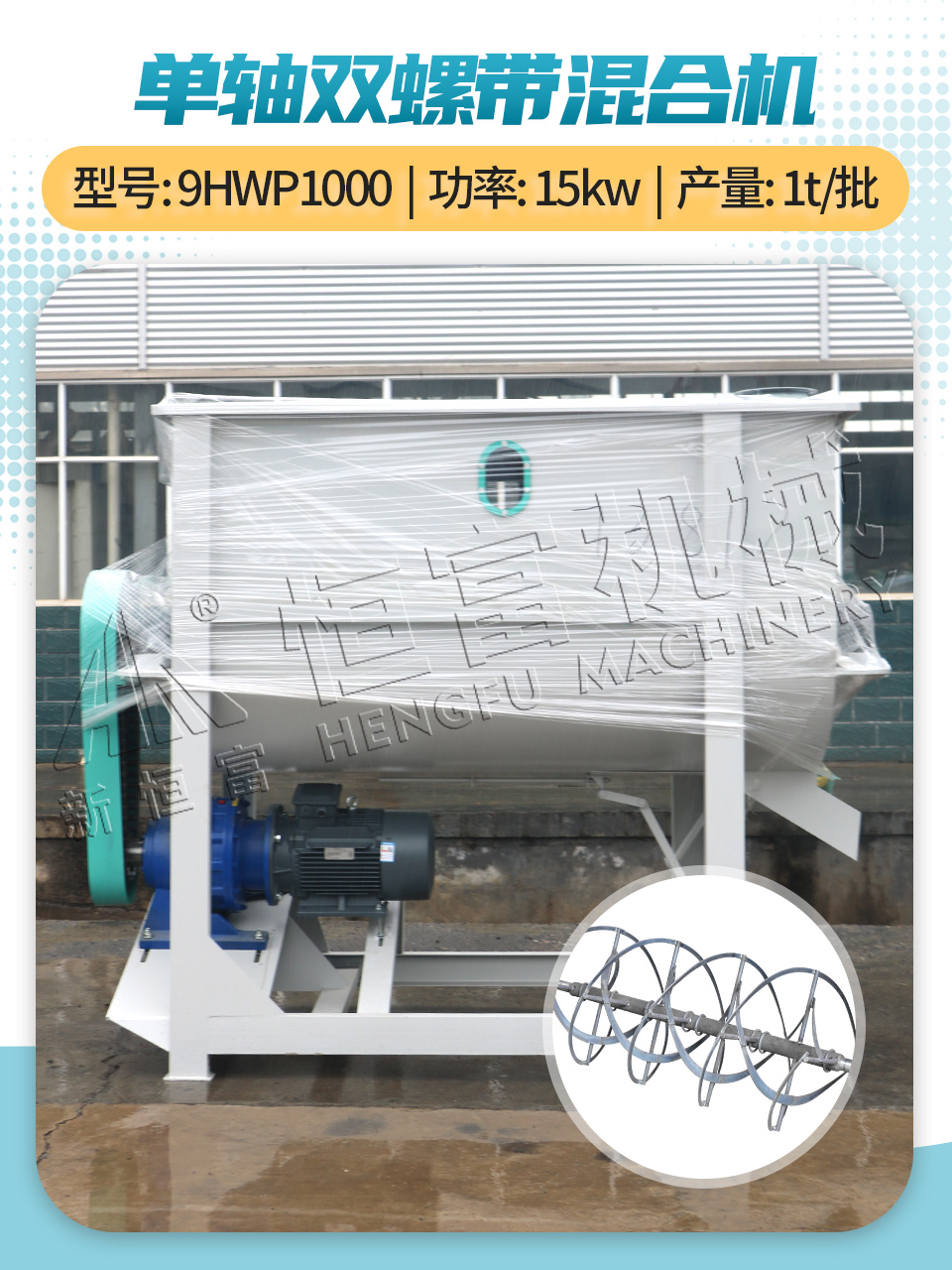 适用范围:大、中型养殖场及饲料加工厂,预混料厂及化工、食品、面粉等行业。 混合均匀度:≥7%;混合时间:3-6分钟一批次。 特点:采用内外双层螺旋设计,混合均匀度高、无残留;设备结构紧凑、运行可靠,能实现快速高效的混合作业。