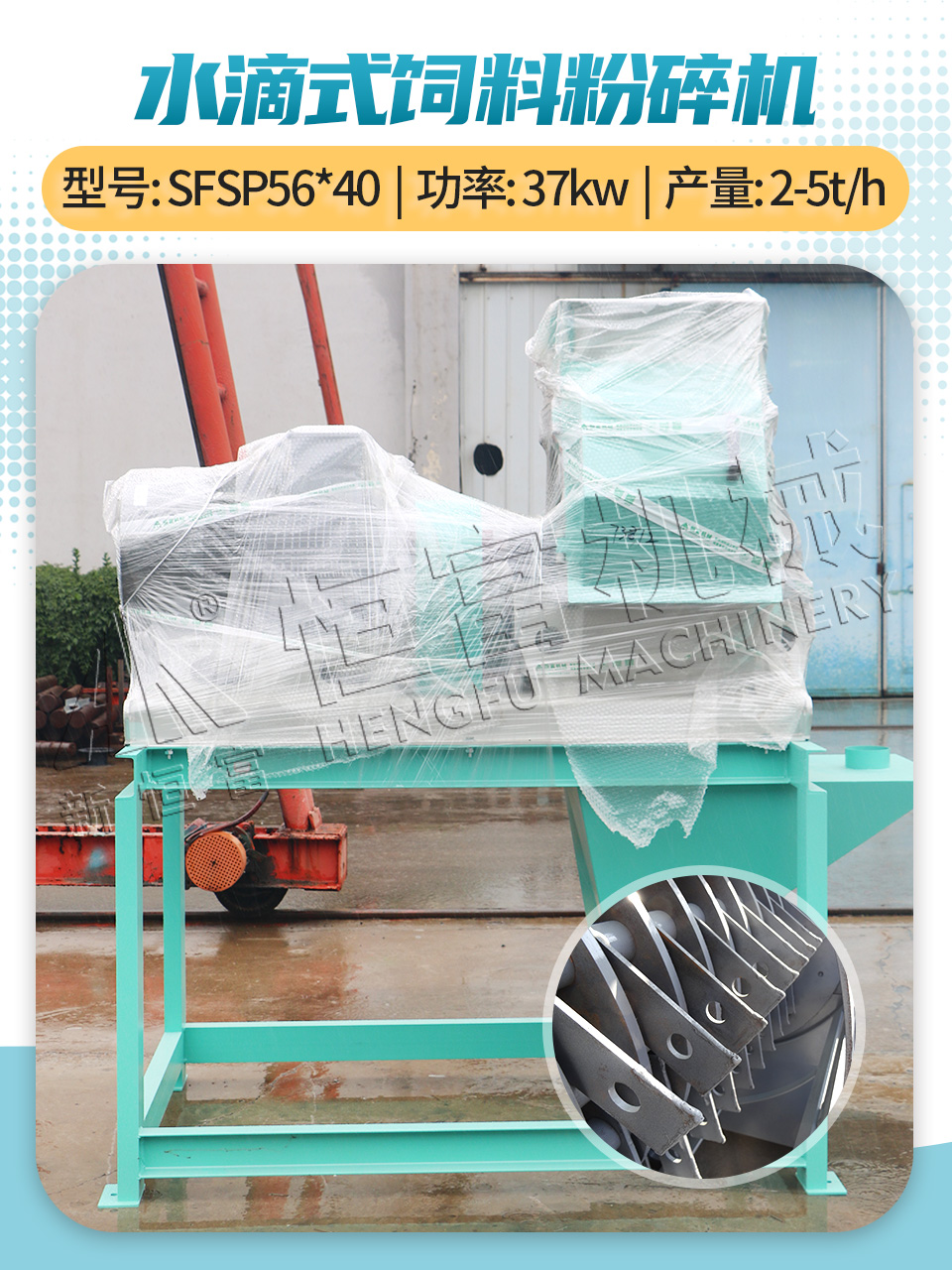 适用动物:猪、牛、羊、鸡、鸭等。 特点:采用独特的水滴形锤片设计,粉碎效率高、粒度均匀;同时运行平稳、噪音低,能耗也显著降低。